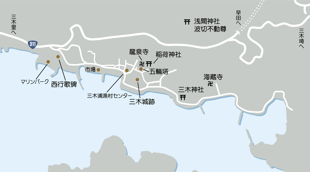 高野山から新宮を経て、海路より伊勢二見浦へと旅をした西行法師。旅の途中、三木浦で詠んだと思われる歌「年経たる浦の海士人言問わん波をかづきて幾世過ぎにき」が『山家集』におさめられている。